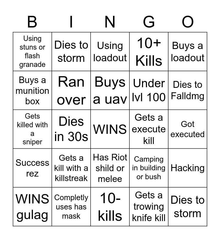This bingo card has a free space and 24 words: Gets a kill with a killstreak, Completly uses has mask, Buys a uav, WINS gulag, Buys a loadout, Using stuns or flash granade, Buys a munition box, Dies to storm, Gets a execute kill, Has Riot shild or melee, Under lvl 100, Gets killed with a sniper, Camping in building or bush, Hacking, Ran over, Gets a trowing knife kill, Got executed, Using loadout, Dies to Falldmg, Dies in 30s, Dies to storm, Success rez, 10+ Kills and 10- kills.