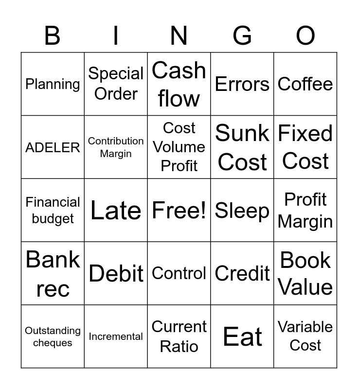 This bingo card has a free space and 24 words: Debit, Incremental, Cost Volume Profit, Outstanding cheques, Coffee, Planning, ADELER, Special Order, Sleep, Control, Sunk Cost, Financial budget, Credit, Book Value, Contribution Margin, Eat, Profit Margin, Cash flow, Fixed Cost, Late, Variable Cost, Bank rec, Errors and Current Ratio.