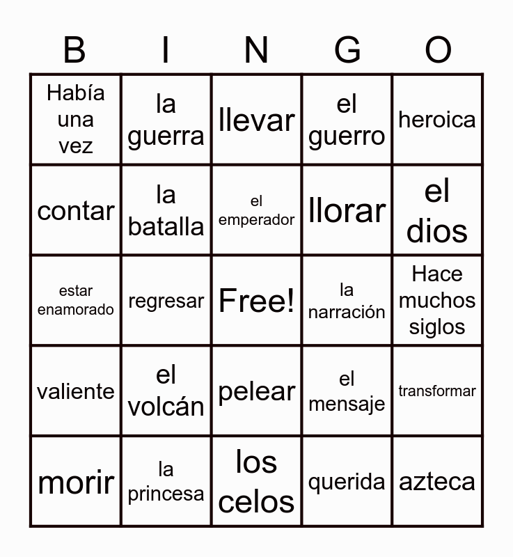 This bingo card has a free space and 24 words: el volcán, la princesa, el emperador, morir, heroica, Había una vez, contar, la guerra, la narración, pelear, llorar, estar enamorado, el mensaje, transformar, la batalla, querida, Hace muchos siglos, llevar, el dios, regresar, azteca, valiente, el guerro and los celos.