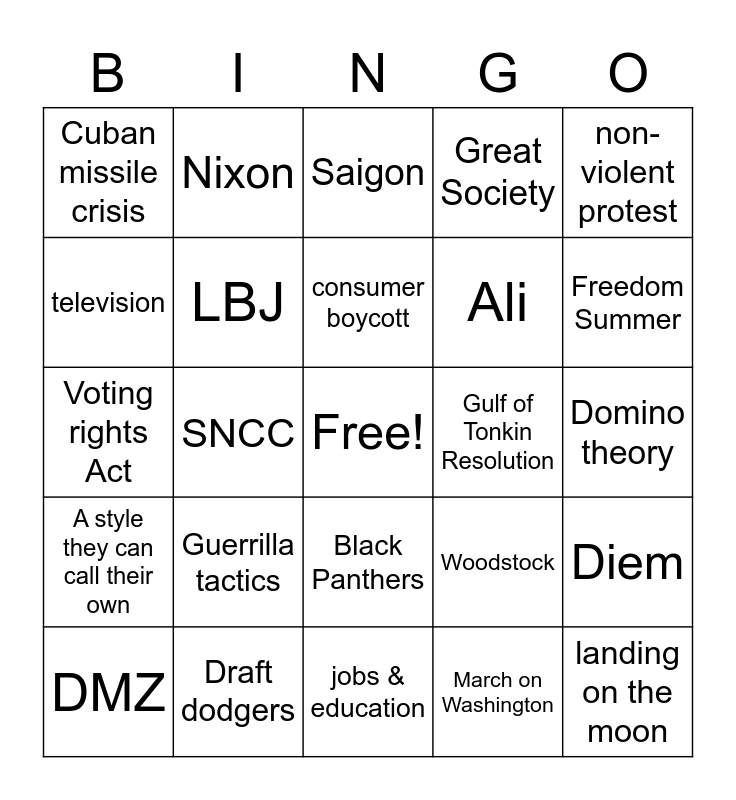 This bingo card has a free space and 44 words: A higher min. wage, Guerrilla tactics, Feminism, March on Washington, Civil Rights act, JFK, LBJ, Sit-in, Great Society, landing on the moon, Cuban missile crisis, Draft dodgers, Woodstock, Domino theory, Cesar Chávez, Brown v. Board, jobs & education, Gulf of Tonkin Resolution, Nixon signs a peace treaty, Voting rights Act, Nixon, Black Panthers, 1960's counter-culture, non- violent protest, Black power, Freedom Riders, consumer boycott, Bay of pigs, Diem, DMZ, Ho Chi Mihn, Saigon, Hanoi, comfort & security, A style they can call their own, "separate but equal", Malcom X, MLK jr., Freedom Summer, television, SNCC, Elvis, Ali and Trump.
