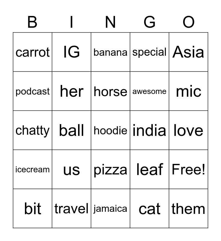 This bingo card has 26 words: pizza, cat, horse, travel, Asia, carrot, podcast, IG, love, leaf, awesome, chatty, Free!, bit, ball, water, special, icecream, banana, hoodie, mic, jamaica, india, us, her and them.