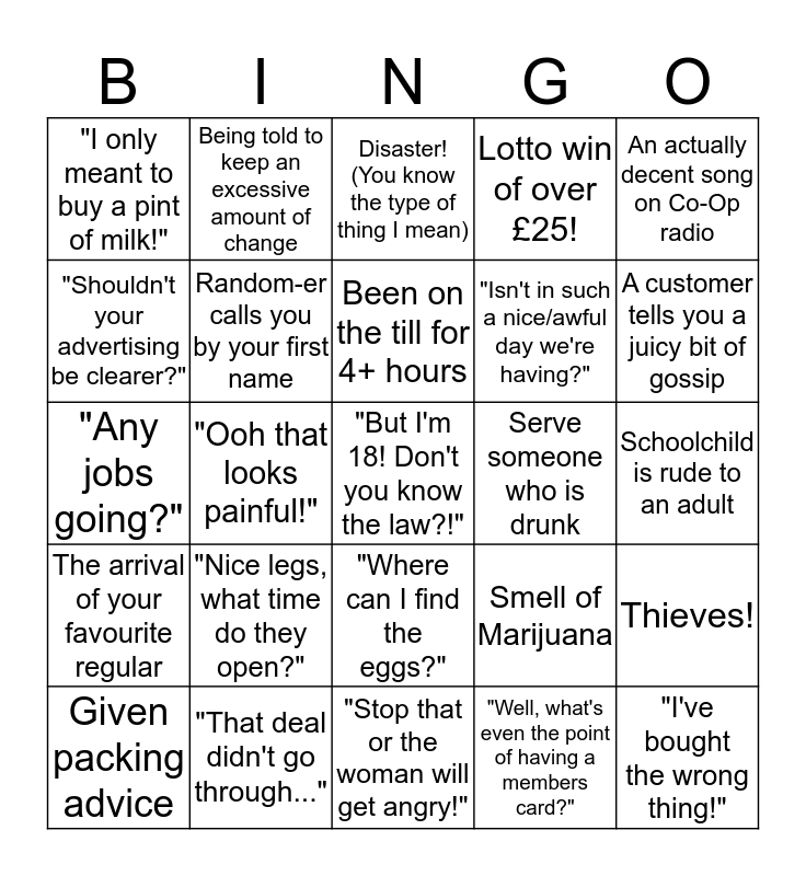 This bingo card has a free space and 24 words: "Nice legs, what time do they open?", "That deal didn't go through...", Been on the till for 4+ hours, Given packing advice, An actually decent song on Co-Op radio, "I only meant to buy a pint of milk!", "Shouldn't your advertising be clearer?", Being told to keep an excessive amount of change, Serve someone who is drunk, "Where can I find the eggs?", "Isn't in such a nice/awful day we're having?", "Any jobs going?", Smell of Marijuana, Thieves!, Random-er calls you by your first name, "Well, what's even the point of having a members card?", Schoolchild is rude to an adult, Disaster! (You know the type of thing I mean), A customer tells you a juicy bit of gossip, "Ooh that looks painful!", "I've bought the wrong thing!", The arrival of your favourite regular, Lotto win of over £25! and "Stop that or the woman will get angry!".