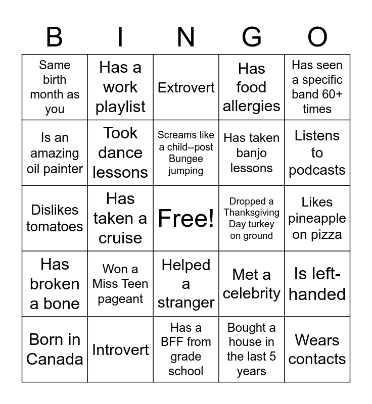 This bingo card has a free space and 39 words: Used to be ambidextrious, Loves karaoke, Climbed Mt. Hood, Took dance lessons, Born in Canada, Helped a stranger, Screams like a child--post Bungee jumping, Has a bucket list, Has seen a specific band 60+ times, Has broken a bone, Has taken a cruise, Has food allergies, Wears contacts, Likes pineapple on pizza, Dropped a Thanksgiving Day turkey on ground, Won a Miss Teen pageant, Can hula hoop, Same birth month as you, Has a nickname, Met a celebrity, Is an amazing oil painter, Has a BFF from grade school, Has taken banjo lessons, Listens to podcasts, Had a secret admirer or stalker, Speaks 2+ languages, Is a good cook, Can drive a stick shift, Watches documentaries, Has a work playlist, Has 0 unread emails, Played a prank on a coworker, Extrovert, Introvert, Bought a house in the last 5 years, Met partner through online dating, Is left-handed, Dislikes tomatoes and Does not have a tattoo.