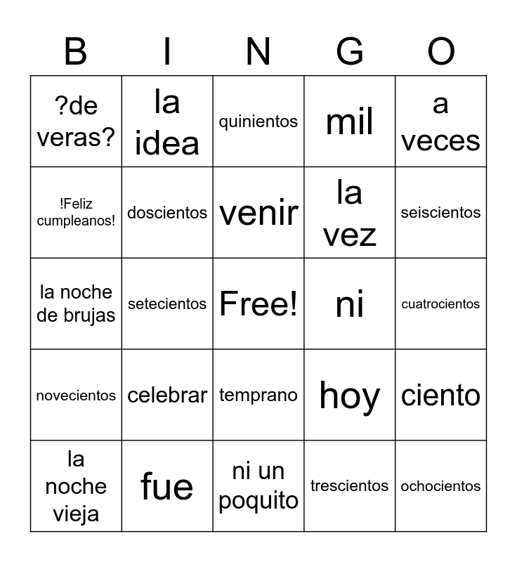 This bingo card has a free space and 24 words: celebrar, fue, venir, la noche vieja, a veces, ?de veras?, !Feliz cumpleanos!, la idea, ni, temprano, la vez, la noche de brujas, hoy, ciento, doscientos, trescientos, cuatrocientos, quinientos, seiscientos, setecientos, ochocientos, novecientos, mil and ni un poquito.