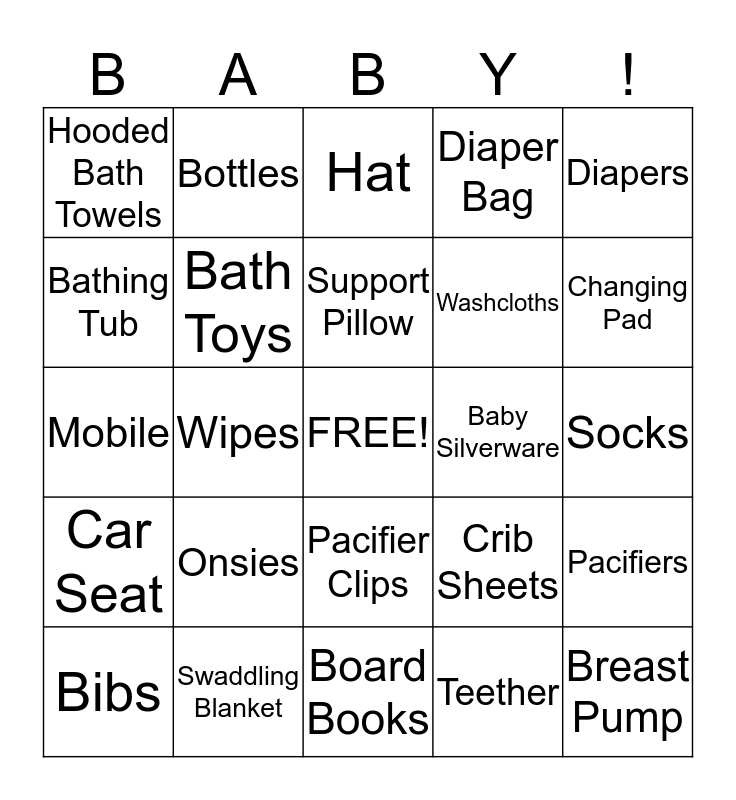 This bingo card has a free space and 24 words: Onsies, Swaddling Blanket, Support Pillow, Bibs, Diapers, Hooded Bath Towels, Bathing Tub, Bottles, Baby Silverware, Pacifier Clips, Washcloths, Mobile, Crib Sheets, Pacifiers, Bath Toys, Teether, Socks, Hat, Changing Pad, Wipes, Breast Pump, Car Seat, Diaper Bag and Board Books.