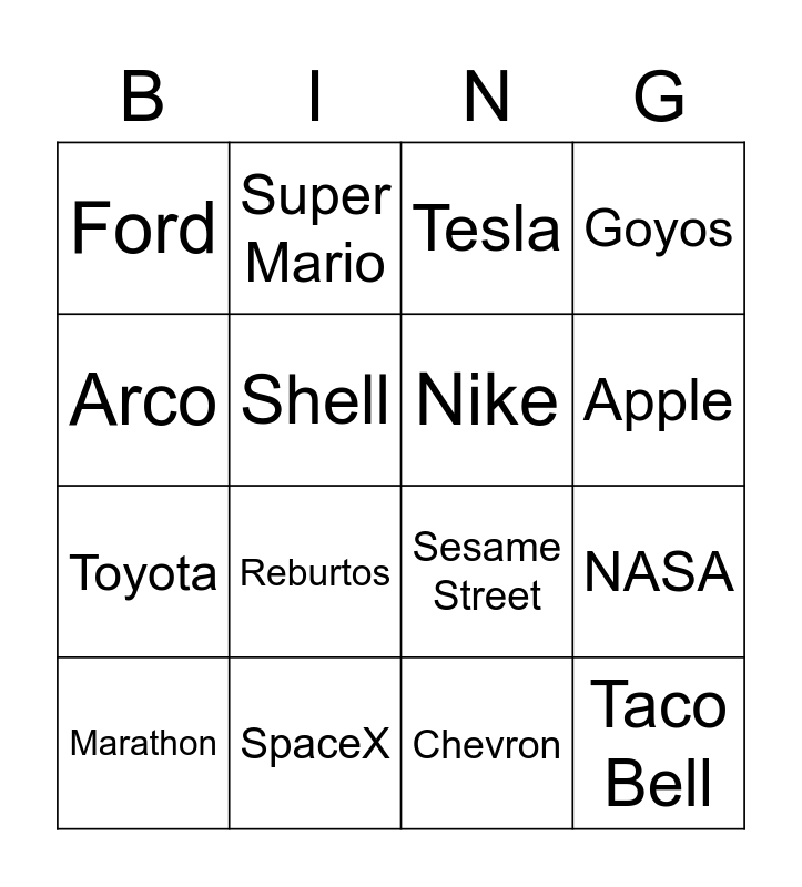 This bingo card has 16 words: SpaceX, NASA, Tesla, Ford, Toyota, Super Mario, Sesame Street, Chevron, Arco, Shell, Marathon, Goyos, Reburtos, Apple, Nike and Taco Bell.
