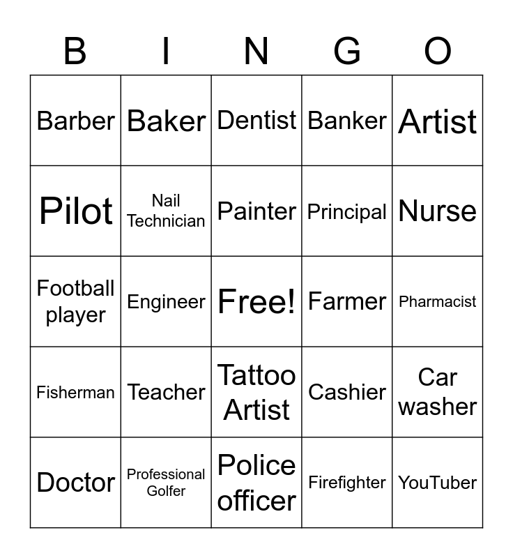 This bingo card has a free space and 25 words: Teacher, Police officer, Painter, Doctor, Artist, Barber, Pilot, Baker, Farmer, Tattoo Artist, Principal, Football player, Cashier, Car washer, Nail Technician, Basketball Player, Pharmacist, Dentist, Nurse, Engineer, YouTuber, Professional Golfer, Fisherman, Banker and Firefighter.
