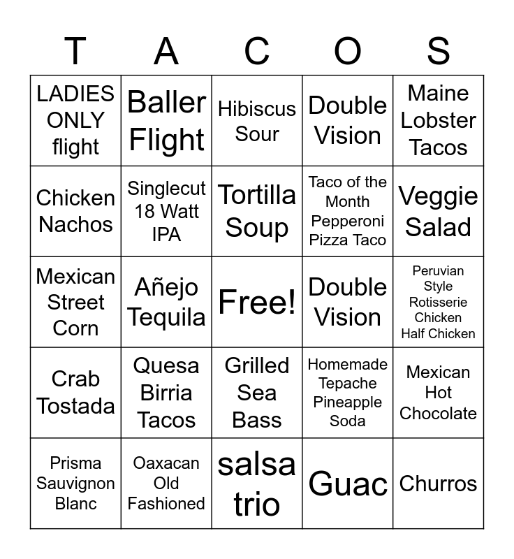 This bingo card has a free space and 24 words: Quesa Birria Tacos, Oaxacan Old Fashioned, Tortilla Soup, Prisma Sauvignon Blanc, Maine Lobster Tacos, LADIES ONLY flight, Chicken Nachos, Baller Flight, Double Vision, Grilled Sea Bass, Taco of the Month Pepperoni Pizza Taco, Mexican Street Corn, Homemade Tepache Pineapple Soda, Mexican Hot Chocolate, Singlecut 18 Watt IPA, Guac, Peruvian Style Rotisserie Chicken Half Chicken, Hibiscus Sour, Veggie Salad, Añejo Tequila, Churros, Crab Tostada, Double Vision and salsa trio.