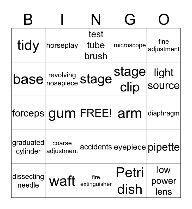This bingo card has a free space and 24 words: coarse adjustment, waft, stage, dissecting needle, fine adjustment, tidy, base, horseplay, arm, accidents, stage clip, forceps, eyepiece, pipette, revolving nosepiece, Petri dish, diaphragm, test tube brush, light source, gum, low power lens, graduated cylinder, microscope and fire extinguisher.