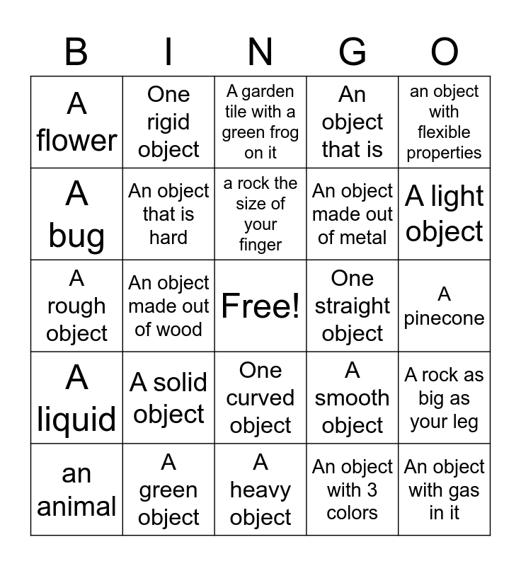 This bingo card has a free space and 24 words: A solid object, A green object, a rock the size of your finger, an animal, an object with flexible properties, A flower, A bug, One rigid object, One straight object, One curved object, An object made out of metal, A rough object, A smooth object, A rock as big as your leg, An object that is hard, An object with 3 colors, A pinecone, A garden tile with a green frog on it, A light object, An object made out of wood, An object with gas in it, A liquid, An object that is and A heavy object.