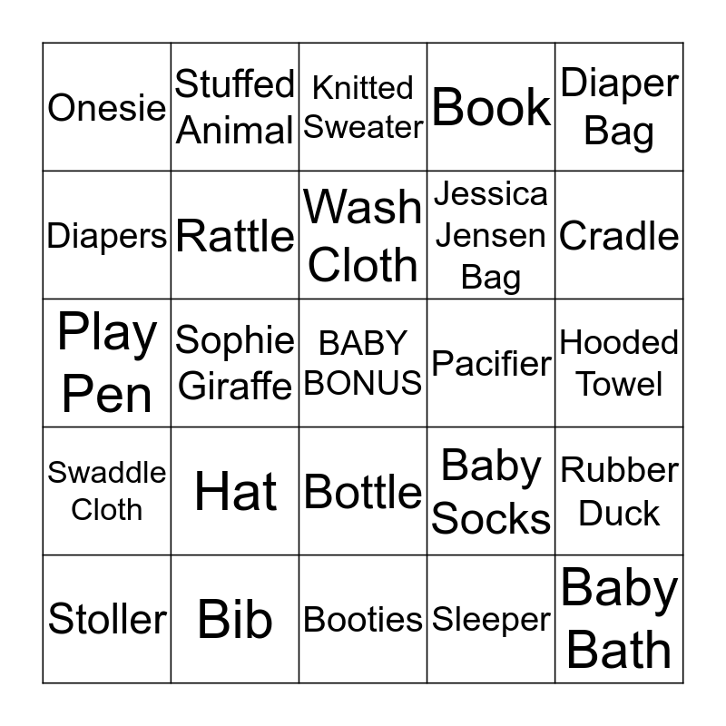 This bingo card has a free space and 24 words: Hat, Bib, Wash Cloth, Stoller, Diaper Bag, Onesie, Diapers, Stuffed Animal, Pacifier, Bottle, Jessica Jensen Bag, Play Pen, Baby Socks, Rubber Duck, Rattle, Sleeper, Hooded Towel, Knitted Sweater, Cradle, Sophie Giraffe, Baby Bath, Swaddle Cloth, Book and Booties.