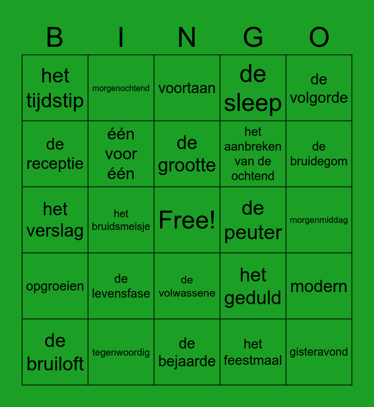 This bingo card has a free space and 24 words: de levensfase, tegenwoordig, de grootte, de bruiloft, de volgorde, het tijdstip, de receptie, morgenochtend, de peuter, de volwassene, het aanbreken van de ochtend, het verslag, het geduld, modern, één voor één, het feestmaal, morgenmiddag, voortaan, de bruidegom, het bruidsmeisje, gisteravond, opgroeien, de sleep and de bejaarde.