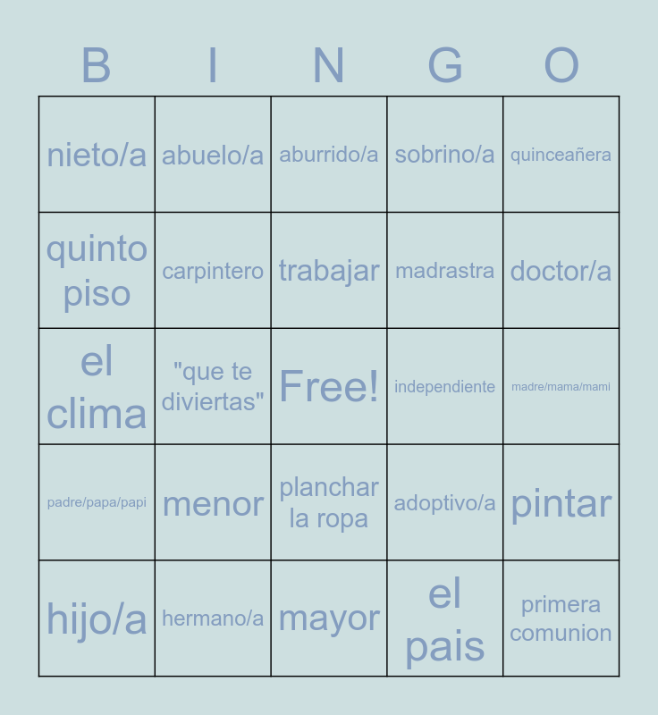 This bingo card has a free space and 24 words: menor, hermano/a, trabajar, hijo/a, quinceañera, nieto/a, quinto piso, abuelo/a, independiente, planchar la ropa, madrastra, el clima, adoptivo/a, pintar, carpintero, el pais, madre/mama/mami, aburrido/a, doctor/a, "que te diviertas", primera comunion, padre/papa/papi, sobrino/a and mayor.