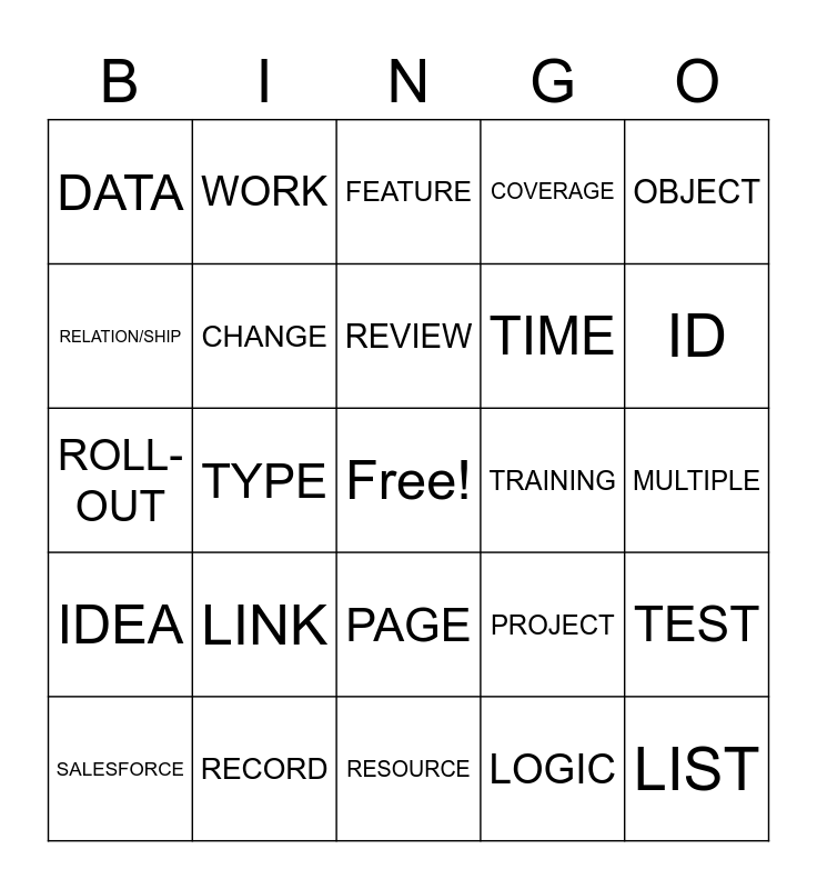 This bingo card has a free space and 24 words: LINK, RECORD, REVIEW, SALESFORCE, OBJECT, DATA, RELATION/SHIP, WORK, TRAINING, PAGE, TIME, ROLL-OUT, PROJECT, TEST, CHANGE, LOGIC, MULTIPLE, FEATURE, ID, TYPE, LIST, IDEA, COVERAGE and RESOURCE.
