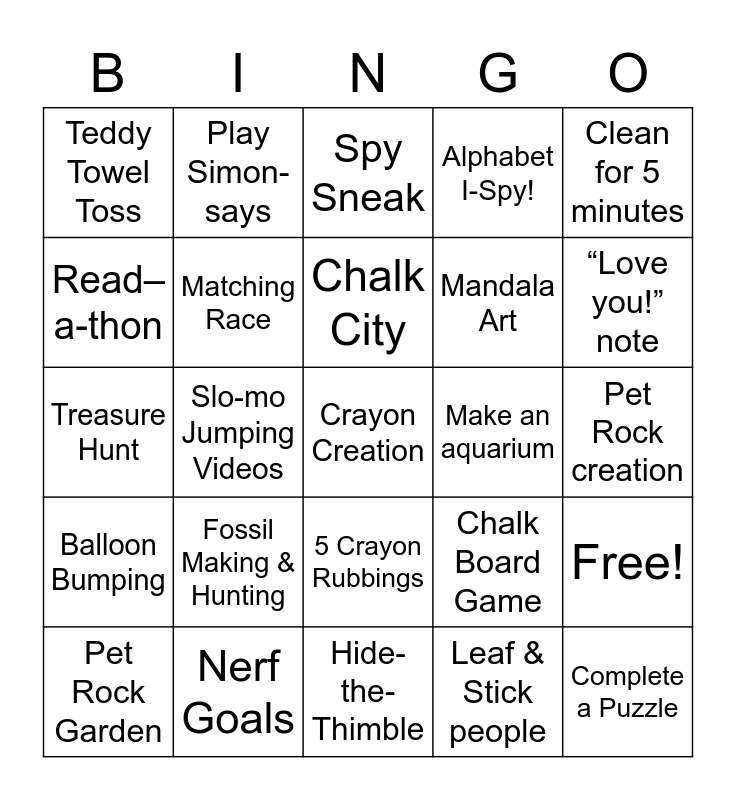 This bingo card has 26 words: 5 Crayon Rubbings, Leaf & Stick people, Chalk City, Nerf Goals, Clean for 5 minutes, Teddy Towel Toss, Read–a-thon, Play Simon-says, Pet Rock creation, Chalk Board Game, Mandala Art, Treasure Hunt, Free!, Pet Rock Garden, Slo-mo Jumping Videos, Shadow Silhouettes, Alphabet I-Spy!, Balloon Bumping, Spy Sneak, Crayon Creation, “Love you!” note, Hide-the-Thimble, Make an aquarium, Fossil Making & Hunting, Matching Race and Complete a Puzzle.