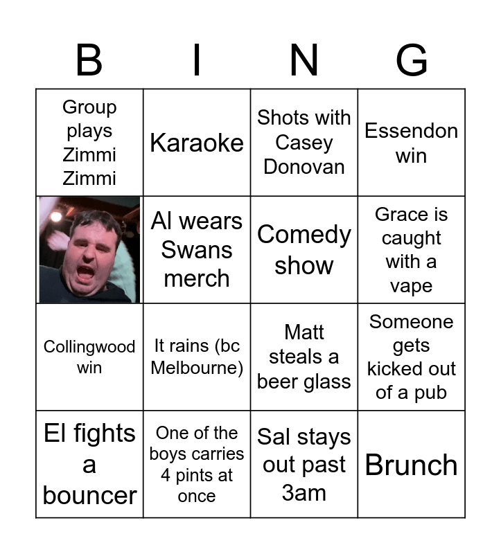 This bingo card has 1 images and 15 words: One of the boys carries 4 pints at once, Someone gets kicked out of a pub, Shots with Casey Donovan, Group plays Zimmi Zimmi, Collingwood win, Karaoke, Matt steals a beer glass, Sal stays out past 3am, Al wears Swans merch, El fights a bouncer, Essendon win, It rains (bc Melbourne), Grace is caught with a vape, Comedy show and Brunch.