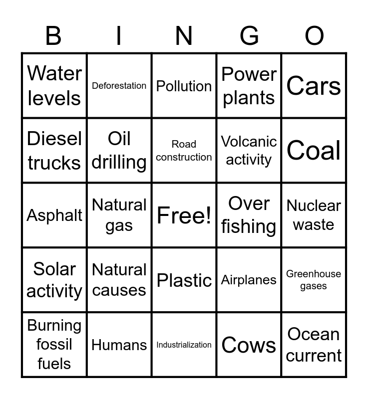 This bingo card has a free space and 24 words: Natural causes, Humans, Road construction, Burning fossil fuels, Cars, Water levels, Diesel trucks, Deforestation, Over fishing, Plastic, Volcanic activity, Asphalt, Airplanes, Greenhouse gases, Oil drilling, Cows, Nuclear waste, Pollution, Coal, Natural gas, Ocean current, Solar activity, Power plants and Industrialization.