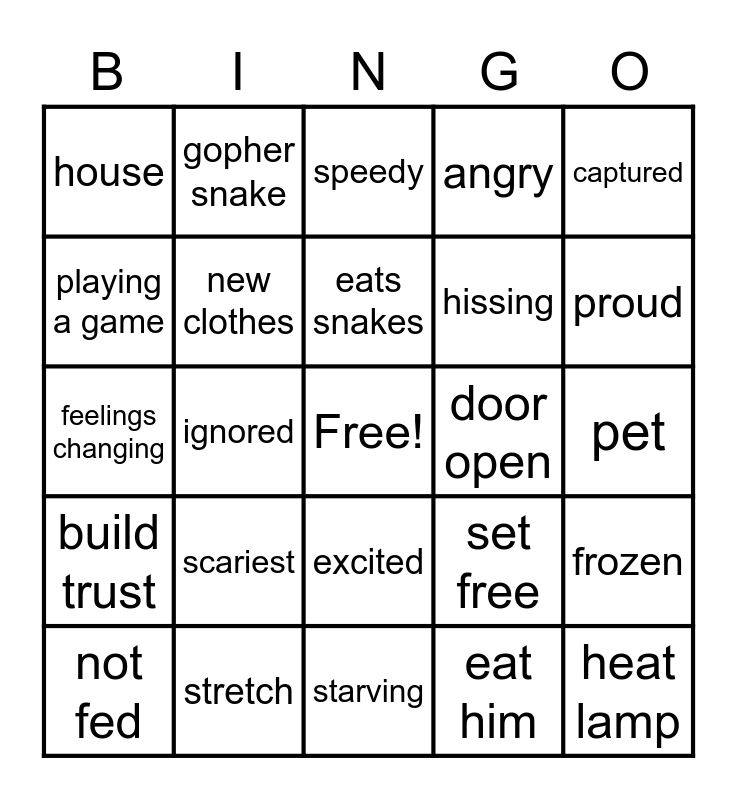 This bingo card has a free space and 24 words: scariest, stretch, eats snakes, not fed, captured, house, playing a game, gopher snake, door open, excited, hissing, feelings changing, set free, frozen, new clothes, eat him, pet, speedy, proud, ignored, heat lamp, build trust, angry and starving.