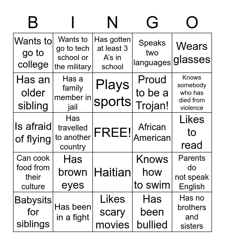 This bingo card has a free space and 24 words: Has brown eyes, Has been in a fight, Plays sports, Babysits for siblings, Wears glasses, Wants to go to college, Has an older sibling, Wants to go to tech school or the military, African American, Haitian, Proud to be a Trojan!, Is afraid of flying, Knows how to swim, Parents do not speak English, Has a family member in jail, Has been bullied, Likes to read, Has gotten at least 3 A’s in school, Knows somebody who has died from violence, Has travelled to another country, Has no brothers and sisters, Can cook food from their culture, Speaks two languages and Likes scary movies.