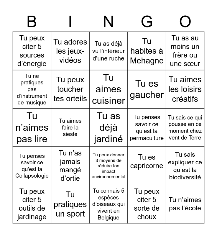 This bingo card has 25 words: Tu n’as jamais mangé d’ortie, Tu connais 5 espèces d’oiseaux qui vivent en Belgique, Tu aimes cuisiner, Tu peux citer 5 outils de jardinage, Tu as au moins un frère ou une sœur, Tu peux citer 5 sources d’énergie, Tu ne pratiques pas d’instrument de musique, Tu adores les jeux-vidéos, Tu penses savoir ce qu’est la permaculture, Tu peux donner 3 moyens de réduire ton impact environnemental, Tu es gaucher, Tu n’aimes pas lire, Tu es capricorne, Tu sais expliquer ce qu’est la biodiversité, Tu peux toucher tes orteils, Tu n’aimes pas l’école, Tu sais ce qui pousse en ce moment chez vent de Terre, Tu as déjà vu l’intérieur d’une ruche, Tu aimes les loisirs créatifs, Tu aimes faire la sieste, Tu as déjà jardiné, Tu pratiques un sport, Tu penses savoir ce qu'est la Collapsologie, Tu habites à Mehagne and Tu peux citer 5 sorte de choux.