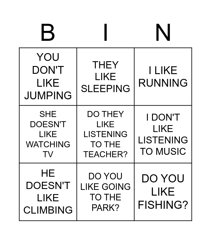 ACTIVITIES | The present simple Bingo | LIKE+ING | LIKE/ LIKES/ DON'T LIKE/ DOESN'T LIKE | English verbs