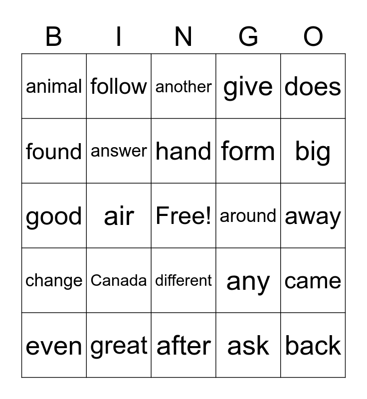 This bingo card has a free space and 31 words: after, again, air, also, animal, another, answer, any, around, ask, away, back, because, before, big, boy, came, Canada, change, different, does, end, even, follow, form, found, give, good, great, hand and help.