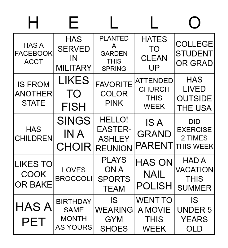 This bingo card has a free space and 24 words: LOVES BROCCOLI, BIRTHDAY SAME MONTH AS YOURS, FAVORITE COLOR PINK, HAS A PET, COLLEGE STUDENT OR GRAD, HAS A FACEBOOK ACCT, IS FROM ANOTHER STATE, HAS SERVED IN MILITARY, IS A GRAND PARENT, PLAYS ON A SPORTS TEAM, ATTENDED CHURCH THIS WEEK, HAS CHILDREN, HAS ON NAIL POLISH, HAD A VACATION THIS SUMMER, LIKES TO FISH, WENT TO A MOVIE THIS WEEK, DID EXERCISE 2 TIMES THIS WEEK, PLANTED A GARDEN THIS SPRING, HAS LIVED OUTSIDE THE USA, SINGS IN A CHOIR, IS UNDER 5 YEARS OLD, LIKES TO COOK OR BAKE, HATES TO CLEAN UP and IS WEARING GYM SHOES.