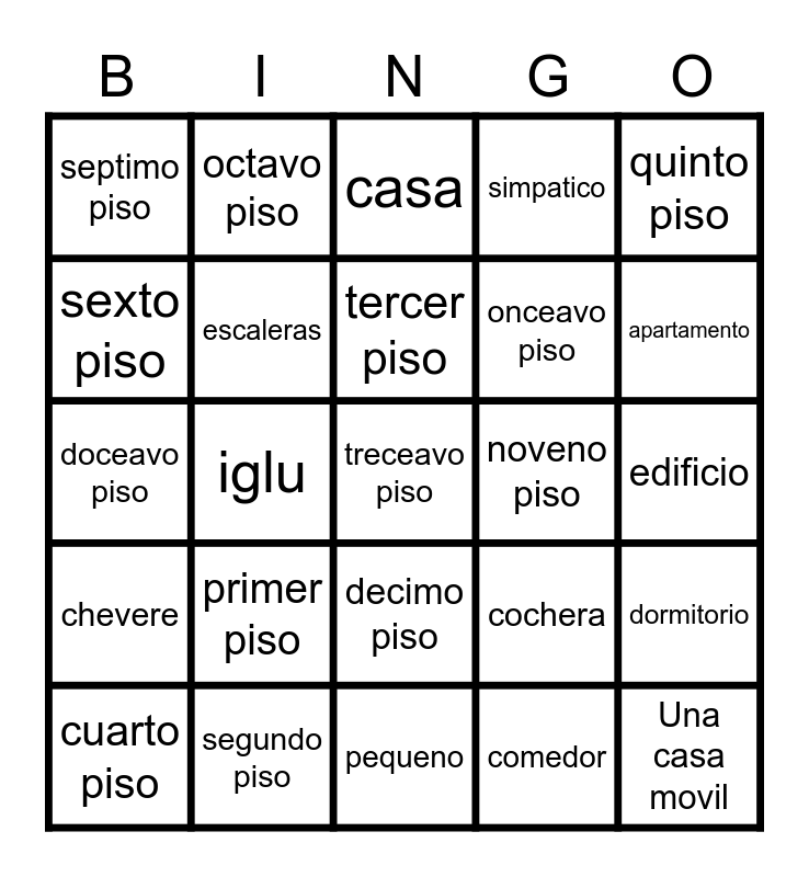 This bingo card has a free space and 24 words: primer piso, segundo piso, tercer piso, cuarto piso, quinto piso, septimo piso, sexto piso, octavo piso, noveno piso, decimo piso, onceavo piso, doceavo piso, cochera, dormitorio, escaleras, comedor, edificio, casa, apartamento, iglu, Una casa movil, chevere, simpatico and pequeno.