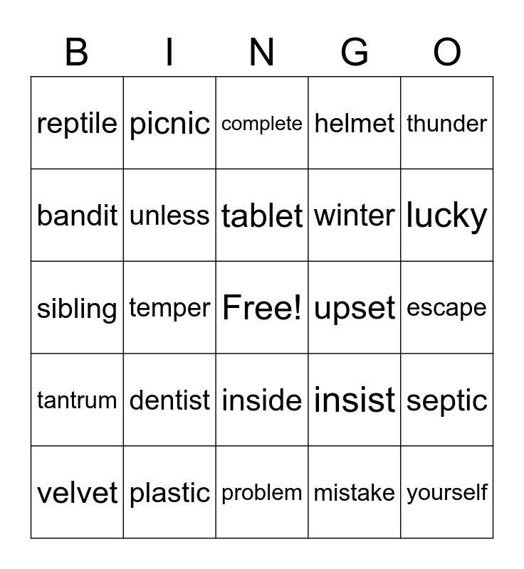 This bingo card has a free space and 24 words: dentist, plastic, tablet, velvet, thunder, reptile, bandit, picnic, upset, inside, winter, sibling, insist, septic, unless, mistake, escape, complete, lucky, temper, yourself, tantrum, helmet and problem.