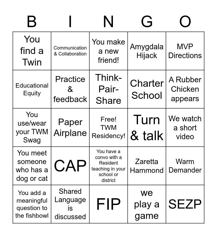 This bingo card has a free space and 50 words: Culturally Responsive Teaching, SEZP, Holyoke / HPS, FIP, CAP, Essential Traits, Communication & Collaboration, Constant Learner, Educational Equity, Professional Standards, Practice & feedback, Amygdala Hijack, Warm Demander, Zaretta Hammond, Relationships, Safe Learning environment, Think-Pair-Share, Turn & talk, BMC, MVP Directions, Paper Airplane, we play a game, You find a Twin, Charter School, Norms, You complete an Exit Ticket, A Rubber Chicken appears, AmeriCorps is mentioned, You make a new friend!, You have a convo with a Resident teaching in your school or district, You have a convo with a Resident teaching in your content area, You introduced yourself to a TWM staff member you haven't met yet, You asked a meaningful question during orientation, You meet someone who has the same hobby as you, Shared Language is discussed, you volunteer to answer a question, Closing the achievement Gap, Let's practice a scenario, Know your Triggers, We watch a short video, we did an icebreaker you will use in your classroom, coach, Lesson Planning, You write a message for someone's envelope, You add a meaningful question to the fishbowl, You use/wear your TWM Swag, You meet a Resident who is a career changer, You send a message on Slack!, You meet someone who has a dog or cat and You meet a Resident from Western Mass.