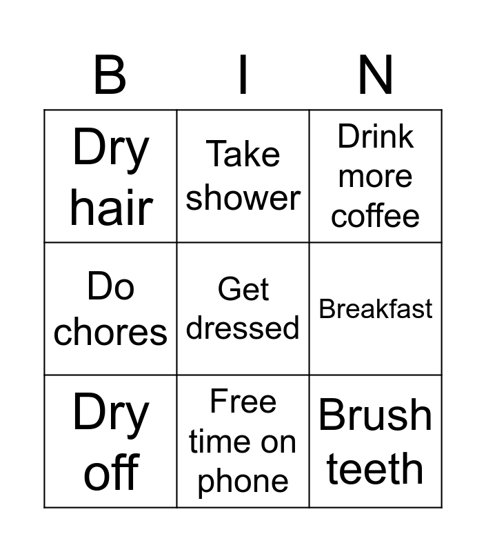 This bingo card has a free space and 8 words: Breakfast, Drink more coffee, Take shower, Dry off, Dry hair, Brush teeth, Do chores and Free time on phone.