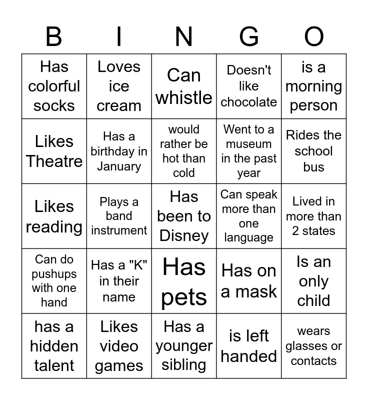 This bingo card has a free space and 29 words: has a hidden talent, Was born in a different state, Plays a band instrument, Plays a sport, Has colorful socks, Can whistle, Has a birthday in January, Has a "K" in their name, Can speak more than one language, Likes video games, Lived in more than 2 states, wears glasses or contacts, Has a younger sibling, is left handed, Rides the school bus, Likes art, Has pets, Can do pushups with one hand, is a morning person, Likes reading, Has on a mask, Has an older sibling, Went to a museum in the past year, Likes Theatre, Doesn't like chocolate, Loves ice cream, Is an only child, would rather be hot than cold and is wearing blue.