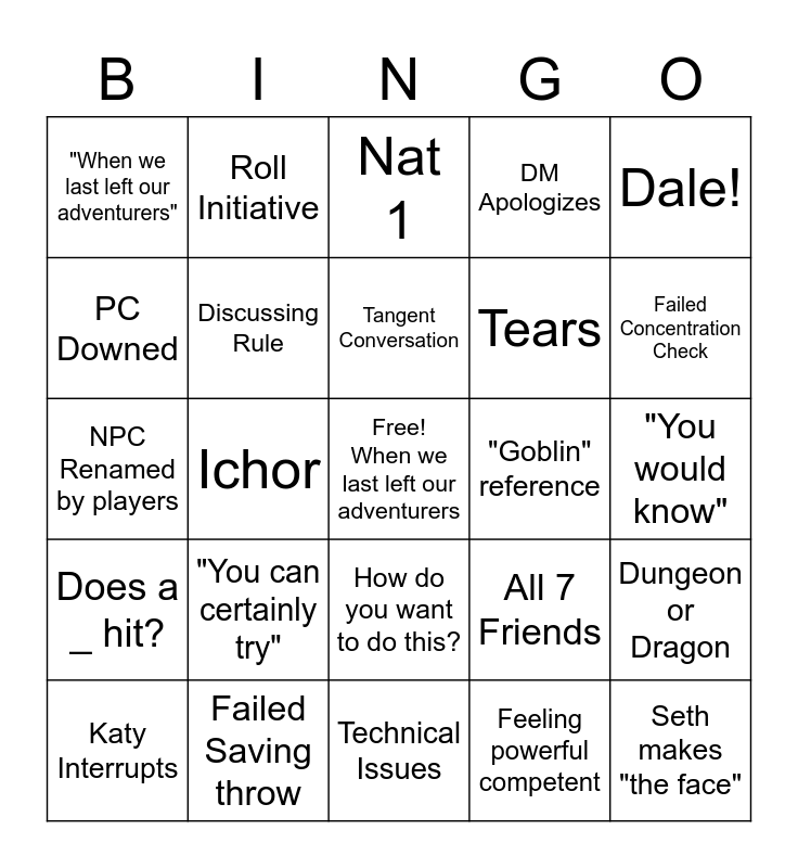 This bingo card has a free space and 27 words: All 7 Friends, Critical!, Tears, Technical Issues, PC Downed, Nat 1, Roll Initiative, Does a _ hit?, "Goblin" reference, Dungeon or Dragon, NPC Renamed by players, DM Apologizes, Katy Interrupts, Failed Saving throw, Failed Concentration Check, Lore Dump, Discussing Rule, Tangent Conversation, "You can certainly try", "When we last left our adventurers", "You would know", Feeling powerful competent, Ichor, Seth makes "the face", How do you want to do this?, Dale! and Nevertheless.