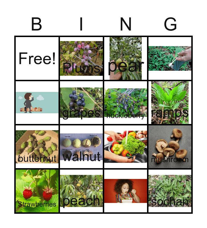 This bingo card has 15 images and 12 words: Strawberries, peach, pear, Plums, mushroom, Free!, grapes, ramps, butternut, walnut, huckleberry and sochan.