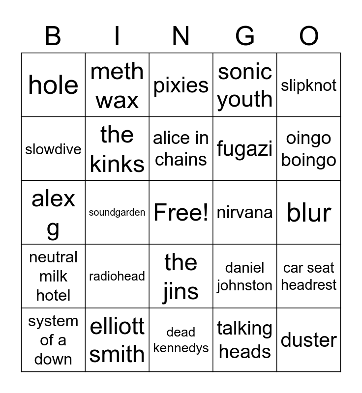 This bingo card has a free space and 24 words: radiohead, elliott smith, alice in chains, system of a down, slipknot, hole, slowdive, meth wax, nirvana, the jins, fugazi, alex g, daniel johnston, car seat headrest, the kinks, talking heads, blur, pixies, oingo boingo, soundgarden, duster, neutral milk hotel, sonic youth and dead kennedys.