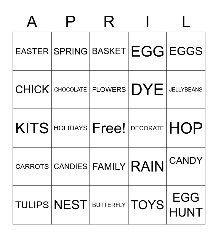 This bingo card has a free space and 38 words: BUNNIES, BUNNY, APRIL, CHOCOLATE, CANDY, CANDIES, FLOWERS, ROSES, EGGS, DYE, HOLIDAYS, EGG, EGG HUNT, HOP, CHICK, CARROTS, RABBIT, BASKET, PEEPS, DECORATE, EASTER, NEST, JELLYBEANS, TULIPS, BEES, BUTTERFLY, BUTTERFLIES, PASTEL, CAKE, SUN, HUNT, FAMILY, TOYS, SPRING, CELEBRATE, RAIN, KITS and RAINBOWS.