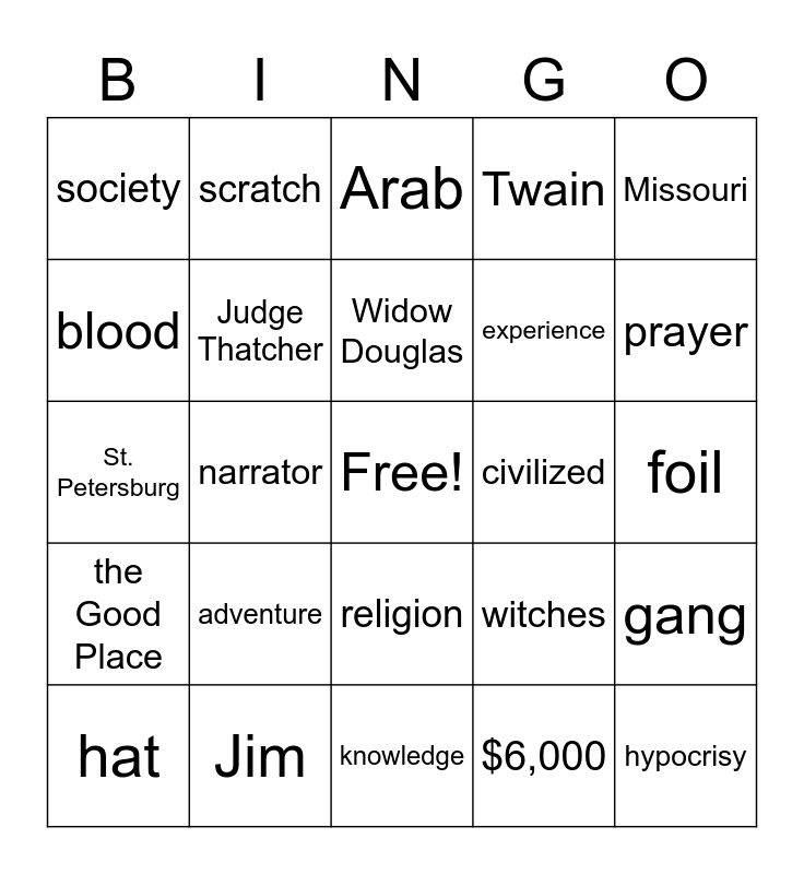 This bingo card has a free space and 41 words: Huck Finn, St. Petersburg, Tom Sawyer, Judge Thatcher, Jim, religion, Widow Douglas, moral, Missouri, the Good Place, narrator, Twain, hypocrisy, foil, civilized, adventure, Miss Watson, society, rob, Arab, gang, freedom, knowledge, experience, lies, robber, $6,000, behavior, prayer, spider, superstition, scratch, hat, candle, witches, blood, ransom, Pap, elephant, picnic and Sunday School.
