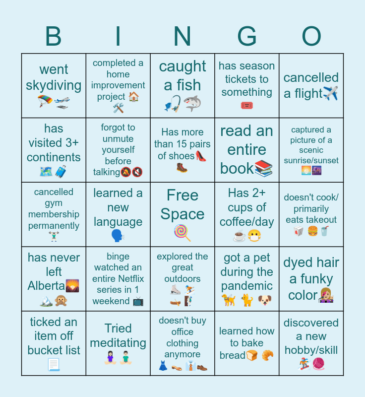 This bingo card has a free space and 24 words: binge watched an entire Netflix series in 1 weekend 📺, Tried meditating🧘🏻♀️🧘🏻♂️, Has more than 15 pairs of shoes👠🥾, ticked an item off bucket list📃, cancelled a flight✈️, went skydiving🪂🛫, has visited 3+ continents🗺🧳, completed a home improvement project 🏠 🛠, Has 2+ cups of coffee/day☕️😷, explored the great outdoors ⛸ ⛷ 🛶 🧗🏻♂️, read an entire book📚, cancelled gym membership permanently 🏋🏻♂️, got a pet during the pandemic🦮 🐈 🐶, dyed hair a funky color👩🏼🎤, forgot to unmute yourself before talking🔕🔇, learned how to bake bread🍞 🥐, doesn't cook/ primarily eats takeout 🥡 🍔🥤, caught a fish 🎣🦈, captured a picture of a scenic sunrise/sunset 🌅🌆, learned a new language🗣, discovered a new hobby/skill🏂🧶, has never left Alberta🌄🏔🙊, has season tickets to something🎟 and doesn't buy office clothing anymore 👗 👡 👔👞.
