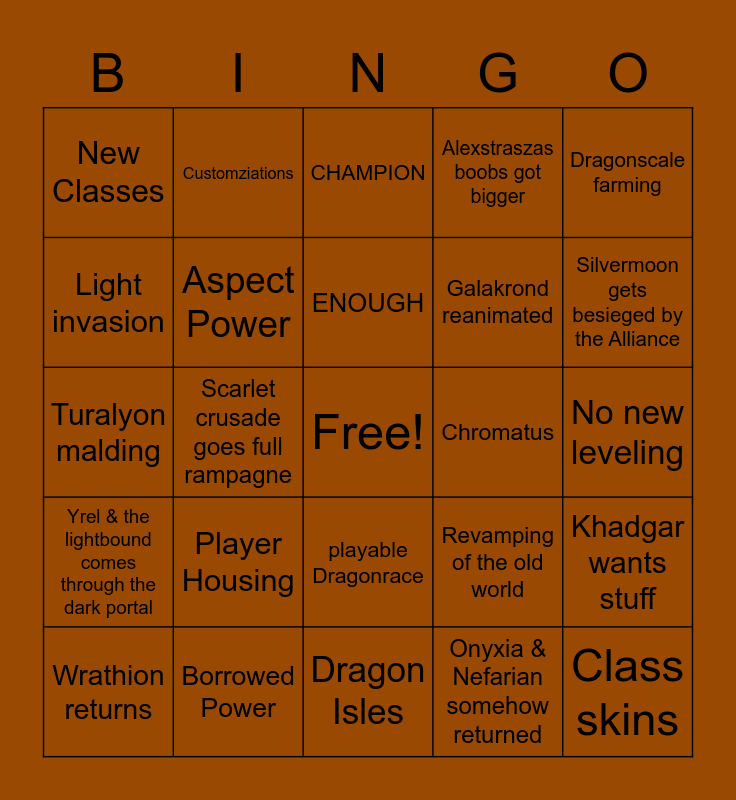 This bingo card has a free space and 24 words: Player Housing, Borrowed Power, ENOUGH, Wrathion returns, Dragonscale farming, New Classes, Light invasion, Customziations, Chromatus, playable Dragonrace, Galakrond reanimated, Turalyon malding, Revamping of the old world, Khadgar wants stuff, Aspect Power, Onyxia & Nefarian somehow returned, No new leveling, CHAMPION, Silvermoon gets besieged by the Alliance, Scarlet crusade goes full rampagne, Class skins, Yrel & the lightbound comes through the dark portal, Alexstraszas boobs got bigger and Dragon Isles.