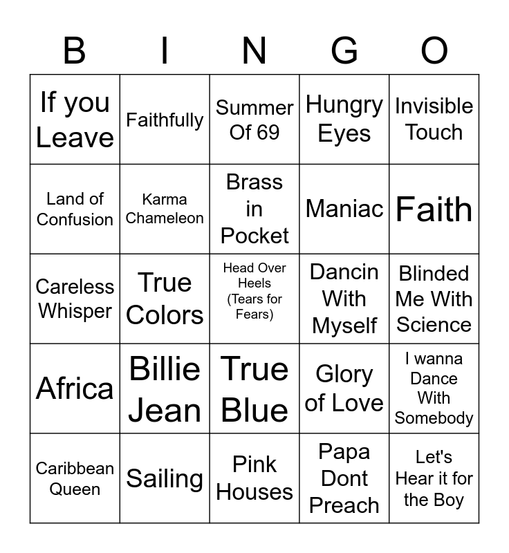 This bingo card has 45 words: Head Over Heels (GoGos), Head Over Heels (Tears for Fears), Live to Tell, Caribbean Queen, I Melt With You, Papa Dont Preach, Summer Of 69, We Got The Beat, Invisible Touch, Sailing, Hungry Eyes, Dancin With Myself, True Blue, Billie Jean, Fame, Pink Houses, Borderline, Careless Whisper, Jesse's Girl, Faith, Faithfully, Open Arms, Dont Stop Believin, If you Leave, Shout, Blinded Me With Science, Nasty Boys, Power of Love, Glory of Love, Africa, 1999, I wanna Dance With Somebody, Who Can it Be Now, These Dreams, Hit Me With Your Best Shot, True Colors, Jack and Diane, Ride Like The Wind, Let's Hear it for the Boy, Brass in Pocket, Land of Confusion, Maniac, Wake Me Up, Karma Chameleon and Hold Me Now.