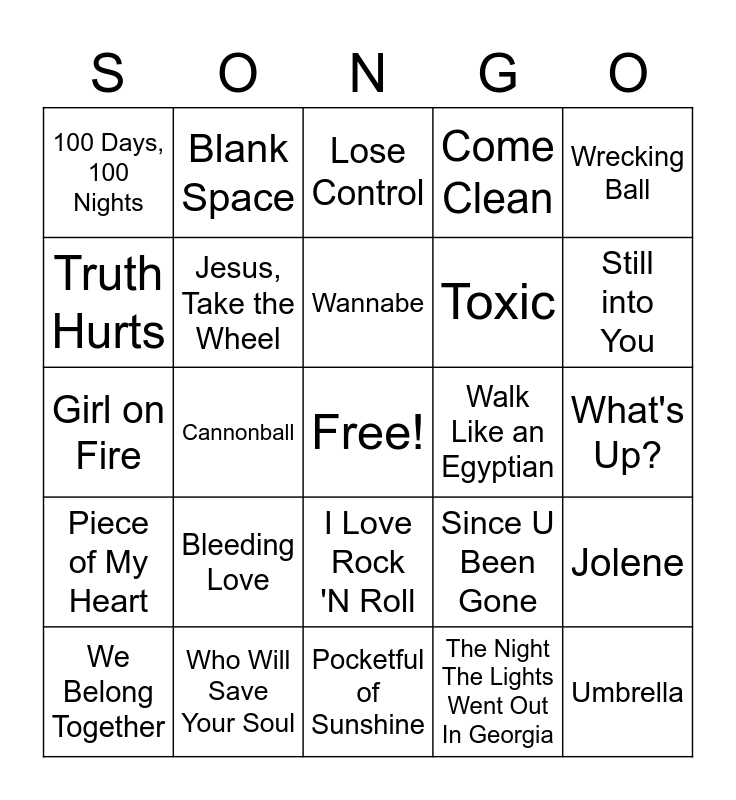 This bingo card has a free space and 42 words: Respect, Wannabe, What a Girl Wants, Bleeding Love, The Night The Lights Went Out In Georgia, Jolene, Umbrella, Criminal, Lose Control, I Love Rock 'N Roll, What's Up?, Still into You, Cannonball, Wrecking Ball, London Bridge, Since U Been Gone, Shoop, Girl on Fire, Price Tag, Blank Space, Truth Hurts, Hips Don't Lie, Bootylicious, 100 Days, 100 Nights, Bulletproof, Love Song, Toxic, Always Be My Baby, Best of My Love, Royals, Sorry Not Sorry, Piece of My Heart, Jesus, Take the Wheel, Pocketful of Sunshine, Hold On, We Belong Together, Who Will Save Your Soul, Walk Like an Egyptian, Love Is A Battlefield, Candy, Come Clean and There's Your Trouble.