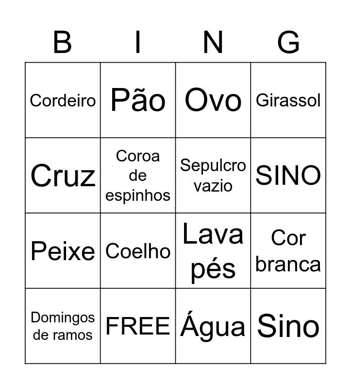 This bingo card has 17 words: Água, Domingos de ramos, Ovo, Cordeiro, Coelho, Girassol, Cor branca, Sepulcro vazio, SINO, Coroa de espinhos, FREE, Lava pés, Cruz, Pão, Peixe, vinho and Sino.