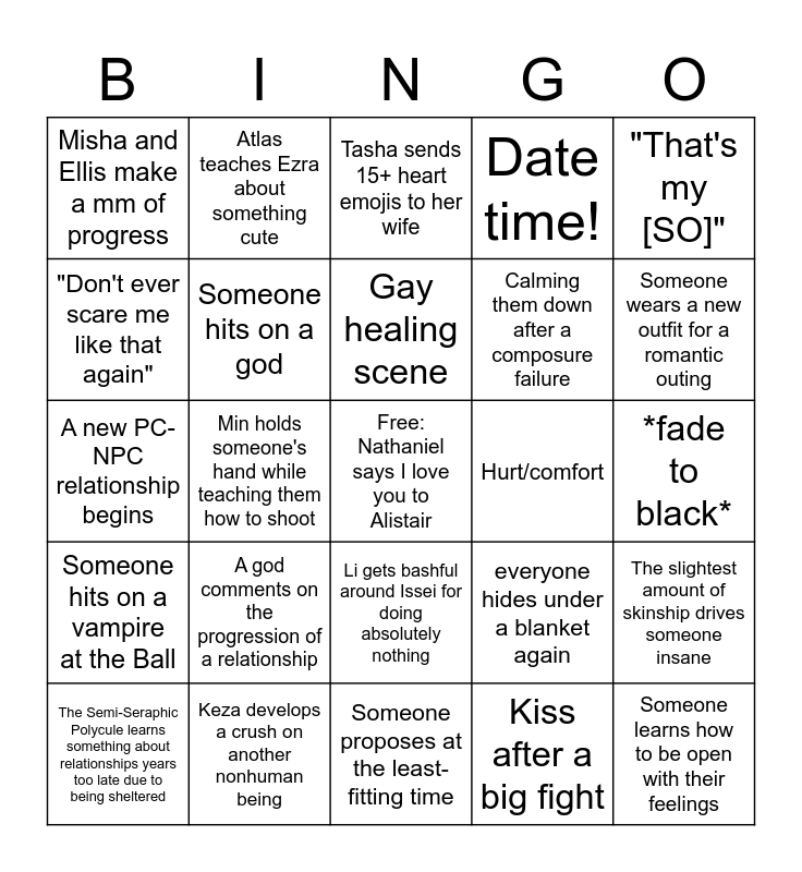 This bingo card has a free space and 24 words: A god comments on the progression of a relationship, Keza develops a crush on another nonhuman being, Gay healing scene, The Semi-Seraphic Polycule learns something about relationships years too late due to being sheltered, "That's my [SO]", Misha and Ellis make a mm of progress, "Don't ever scare me like that again", Atlas teaches Ezra about something cute, Hurt/comfort, Li gets bashful around Issei for doing absolutely nothing, Calming them down after a composure failure, A new PC-NPC relationship begins, everyone hides under a blanket again, The slightest amount of skinship drives someone insane, Someone hits on a god, Kiss after a big fight, *fade to black*, Tasha sends 15+ heart emojis to her wife, Someone wears a new outfit for a romantic outing, Min holds someone's hand while teaching them how to shoot, Someone learns how to be open with their feelings, Someone hits on a vampire at the Ball, Date time! and Someone proposes at the least-fitting time.
