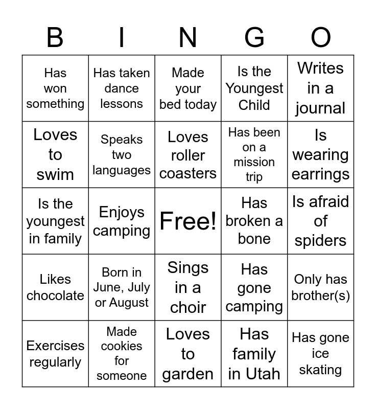 This bingo card has a free space and 72 words: Is wearing blue, Has taken dance lessons, Loves to garden, Likes tomatoes, Has a pet, Plays a musical instrument, Speaks two languages, Has been to the ocean, Has broken a bone, Has been in a play, Loves to swim, Owns a pair of flip flops, Has gone camping, Writes in a journal, Likes to cook, Enjoys camping, Is the Middle Child, Is the Youngest Child, Visited another country, Has won something, Made cookies for someone, Sings in a choir, Has family in Utah, Has gone ice skating, Likes to read, Has taken piano lessons, Knows a Bible verse in a different language, Has a dog, Has baked bread, Plays an instrument, Has run a 5K, Has brown eyes, Has naturally curly hair, Has Blue Eyes, Is the youngest in family, Has had stitches, Never been to Disneyland, Likes sushi, Is wearing earrings, Exercises regularly, Plays or played on a sports team, Favorite season is summer, Gave a compliment today, Likes to go fishing, Wears glasses, Born in June, July or August, Is a lefty, Has more than two siblings, Did not have soft drink today, Favorite pizza is pepperoni, Born in another state, Never walked to school, Taught a lesson, Is afraid of spiders, Likes chocolate, Eats vegetables daily, Made your bed today, Has been on a mission trip, Knows the Primary Colors, Knows how to knit, Favorite color is purple, Was born in December, Chooses salty over sweet, Only has brother(s), Does not drink milk, Has/Had braces, Loves roller coasters, Has allergies, Plays Basketball, Can Draw, Can whistle and Volunteers at church.