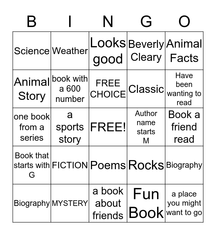 This bingo card has a free space and 24 words: FICTION, MYSTERY, FREE CHOICE, Biography, Animal Facts, Science, Animal Story, Weather, Author name starts M, Poems, Classic, one book from a series, Rocks, Biography, book with a 600 number, Fun Book, Book a friend read, Looks good, Have been wanting to read, a sports story, a place you might want to go, Book that starts with G, Beverly Cleary and a book about friends.