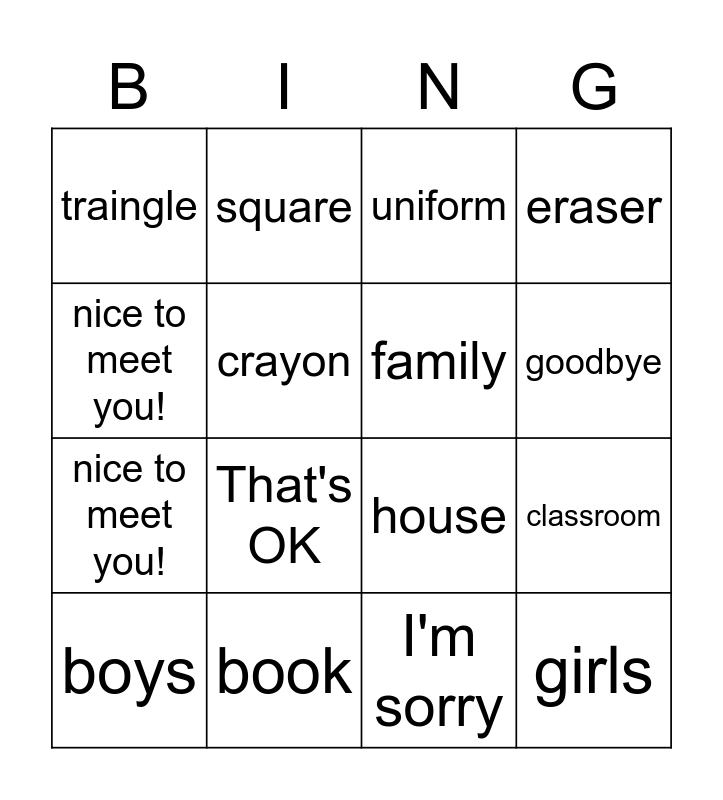 This bingo card has 19 words: boys, pencil, uniform, classroom, rectangle, crayon, I'm sorry, eraser, traingle, That's OK, family, goodbye, nice to meet you!, book, house, girls, square, nice to meet you! and circle.