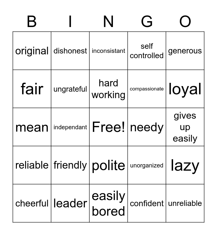 This bingo card has a free space and 24 words: friendly, leader, hard working, cheerful, generous, original, fair, dishonest, needy, polite, compassionate, mean, unorganized, lazy, ungrateful, confident, gives up easily, inconsistant, loyal, independant, unreliable, reliable, self controlled and easily bored.