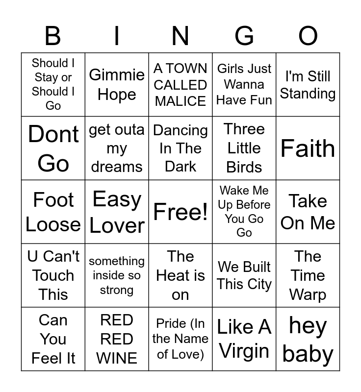 This bingo card has a free space and 74 words: 9 to 5, 500 Miles, A TOWN CALLED MALICE, ADDICENT TO LOVE, All Night Long, BABY JANE, Baggy Trousers, Beat It, Can You Feel It, Centerfold, Chain Reaction, CLUB TROPICANA, Dancing In The Dark, Dont Go, Don't Leave Me This Way, Easy Lover, EVERY LITTLE THING SHE DOES IS MAGIC, Faith, Flash dance, Foot Loose, get outa my dreams, Gimmie Hope, Girls Just Wanna Have Fun, man eater, hey baby, I Just Called To Say I love You, I KNEW YOU WERE WAITING, I Think We're Alone No, I Want That Man, Im So Excited, I'm Still Standing, i've got my mind set on you, JUST CANT GET ENOUGH, Karma Chameleon, La Bamba, Like A Virgin, Livin’ on a prayer, Loco In Acapulco, Locomotion, PAPA DON'T PREACH, Pride (In the Name of Love), RED RED WINE, Ride on Time, She Drives Me Crazy, shot through the heart, Should I Stay or Should I Go, Smalltown Boy, something inside so strong, Spirit In The Sky, Summer of 69, Sweet Child 'O Mine, Sweet Dreams (Are Made of This), Take On Me, TEARDROPS, Tell It To My Heart, simple the Best, The Heat is on, The Lion Sleeps Tonight, The only way is up, The Time Warp, Three Little Birds, Two Hearts, U Can't Touch This, Uptown Girl, Wake Me Up Before You Go Go, Walk Like A Egyptian, Walk Of Life, Walking On Sunshine, We Built This City, We close our eyes, We don't have to take our clothes off, We Will Rock You, You Can Call Me Al and You Spin Me Round.