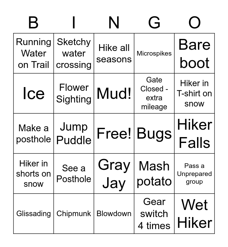 This bingo card has a free space and 24 words: See a Posthole, Chipmunk, Mud!, Glissading, Bare boot, Running Water on Trail, Ice, Sketchy water crossing, Bugs, Gray Jay, Gate Closed - extra mileage, Make a posthole, Mash potato, Pass a Unprepared group, Flower Sighting, Gear switch 4 times, Hiker Falls, Hike all seasons, Hiker in T-shirt on snow, Jump Puddle, Wet Hiker, Hiker in shorts on snow, Microspikes and Blowdown.