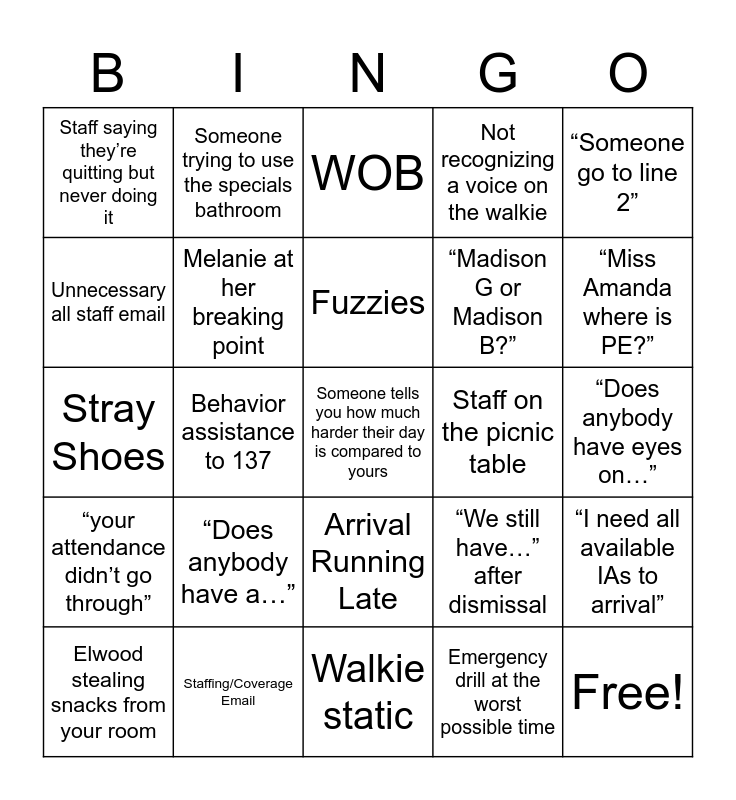 This bingo card has 34 words: Free!, Emergency drill at the worst possible time, “The ______ bathroom is closed”, “Are we leaving at 2:30? I’m leaving at 2:30”, “your attendance didn’t go through”, Melanie at her breaking point, “Someone go to line 2”, Elwood stealing snacks from your room, Someone trying to use the specials bathroom, “Can we get a mop to ______”, Fuzzies, WOB, Someone trying to find Sydney, Staff on the swing set, Staff on the picnic table, “Miss Amanda where is PE?”, Staffing/Coverage Email, Stray Shoes, “Does anybody have a…”, “We still have…” after dismissal, Arrival Running Late, Random staff beef, Staff saying they’re quitting but never doing it, “Does anybody have eyes on…”, Walkie static, Someone tells you how much harder their day is compared to yours, Not recognizing a voice on the walkie, Two walkies in a classroom, one of them stays on line 2, “Madison G or Madison B?”, Unnecessary all staff email, Melanie is down an IA, Behavior assistance to 137, “I need all available IAs to arrival” and Mario creeping up behind you to chat.